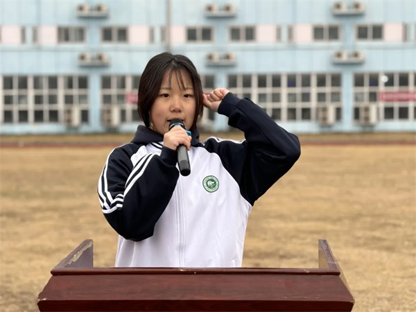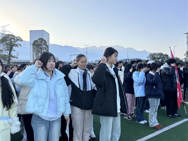 在24幼儿保育班游芷馨同学的带领下,全体学生高举右拳,在国旗下庄严宣誓。