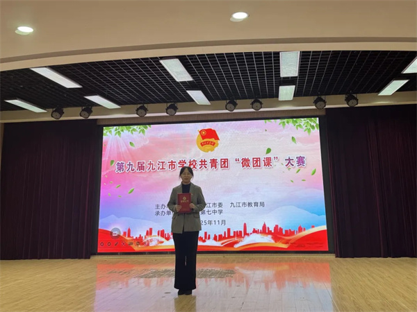 2025年11月11日,由共青团九江市委员会、九江市教育局主办的第九届九江市学校共青团“微团课”大赛在九江市第七中学举行。我校青年教师张思思表现出色荣获中学中职组一等奖,载誉而归。这不仅展现了我校教师的风采,也为学校争光添彩。在此,向张思思老师表示热烈的祝贺!